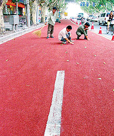 位于南京市洪武南路路口至中山南路路口的南京首條彩色道路不久前鋪設完畢并通車,該彩色道路全長200米。這條彩色道路是用一種高分子樹酯稀漿涂抹于路面,并撒上耐磨的彩色陶瓷顆粒鋪設而成。彩色道路不僅美化了路面,而且更有利于交通安全。該路防滑、美觀,可以隨意改變色彩,一改以往南京清一色柏油馬路的狀況。