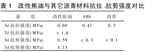 (1)改性焦油(比例1)與其它瀝青材料抗拉、抗剪強度對比,結果見表1。