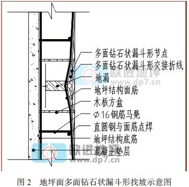 3.3.4 為確保多面鉆石狀漏斗成型,地坪結構面筋節點下布設一根ф16 圓鋼直馬凳,按該節點標高下35mm 為面筋頂面,確保保護層的統一。