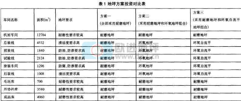 本項目聯合廠房建筑面積約3.2萬m2,主要包括機加車間、總裝車間、預裝車間、試車間、涂裝車間、后裝車問、毛坯庫、外協件庫、成品庫等區域,各區域地坪方案對比分析如下:(如表I)。