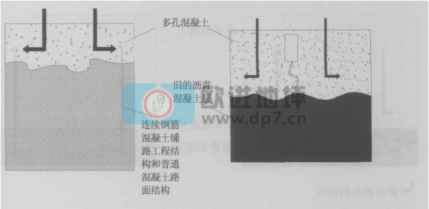 這種路面(右上圖)屬于排水型路面結構,結構的承載能力由下層的瀝青混凝土層和上層5cm--10cm的多孔混凝土層為一體的結構來承載。這種路面結構可以作為鋪筑新的混凝土結構層,也可以用做舊的混凝土路面的修繕工程。