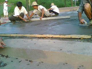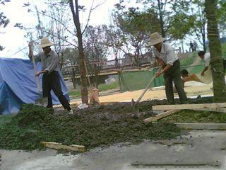 | | 藝術地坪施工2. 攤鋪標準砼.推薦配合比為:32.5水泥424KG,粗沙400KG,細沙400KG,石子(瓜子片)1100KG,水185-195KG; |