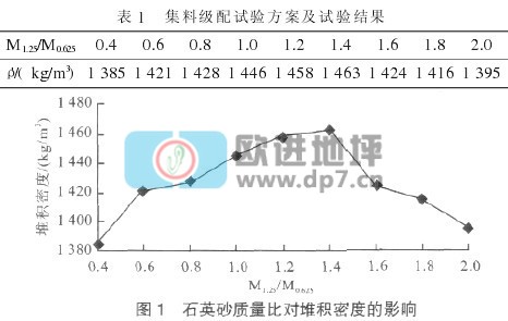 集料的級配對材料的強度、工作性、耐久性有著較大的影響,將兩種粒級石英砂以不同質量比(M1.25/M0.625)進行混合,測試其堆積密度(ρ'),并選擇最大堆積密度所對應的比例對兩種粒級石英砂進行摻配,可使地坪硬化劑在固定膠凝材料用量的基礎上盡量致密并減少干縮。試驗結果見表1。如圖1所示,混合后的集料堆積密度隨M1.25/M0.625的變化而呈拋物線規律變化,其最大點位于M1.25/M0.625為1.4處,最大堆積密度為1 463 kg/m3。