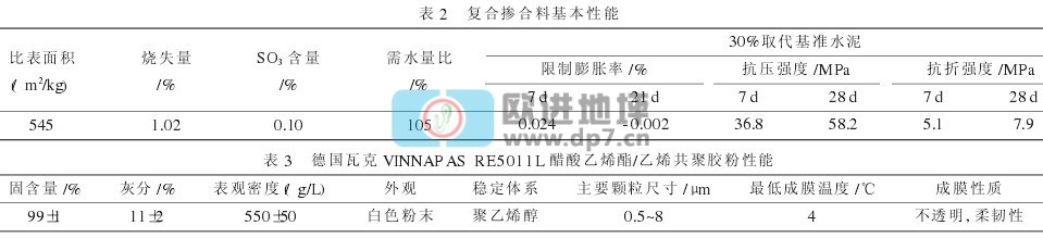 水泥砂漿中摻入超細粉煤灰和礦渣微粉,不僅可以提高砂漿的綜合性能,而且有著積極的社會效益。單摻粉煤灰使砂漿的早期強度明顯下降,但后期強度有較大增長,甚至超過不摻粉煤灰的砂漿。礦粉單獨使用時,對早期強度影響不大,后期強度有很好的增長,但摻入礦粉后,砂漿的自收縮有可能增大,礦粉越細,自收縮越大。將粉煤灰和礦粉復合混磨,可以獲得對砂漿性能的有效改善,而且粉煤灰和礦粉的二次水化作用物理填充作用可以提高砂漿的密實度,同時可彌補由于單摻聚合物膠粉所導致的強度下降[2]。天然硅灰石粉具有較好的纖維形態,有研究表明一定摻量的硅灰石粉可提高水泥膠砂試件的抗折強度[3]。另外,考慮到上述材料的添加有可能使干粉砂漿的收縮增加,為此在復合摻合料中摻入膨脹組分。將粉煤灰、礦渣粉、天然硅灰石粉及膨脹組分進行混磨,過篩,形成復合摻合料,其性能見表2。