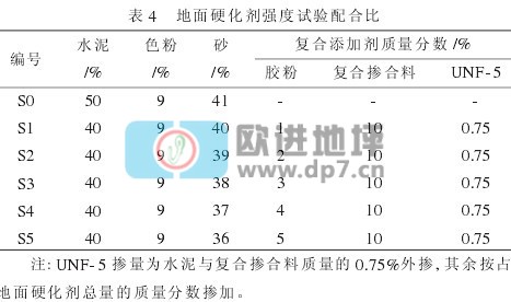 (1)硬化耐磨地坪干粉砂漿添加劑由可再分散乳膠粉、復合摻合料、UNF-5高效減水劑按合理配合比構成。推薦摻量為英砂39%,膠粉2%,復合摻合料10%,UNF-5外摻0.75%。