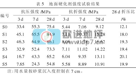 地面硬化劑強度試驗的配合比見表4。試件的成型按JC/T 906—2002《混凝土地面用水泥基耐磨材料》中有關規定進行。砂漿成型后先在溫度(20±3)℃、相對濕度80%以上的條件下濕養護2d,再放入(20±1)℃的水中養護5d,之后置于(20±3)℃、相對濕度60%的條件下養護21d。按GB/T17671—1999《水泥膠砂強度檢驗方法(ISO法)》進行強度試驗,結果列于表5中。