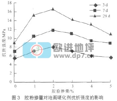 (1)如圖2所示,隨膠粉摻量的增加,地面硬化劑各齡期抗壓強度變化趨熱大致相同,抗壓強度有上升階段,隨后下降。當膠粉摻量為1%、2%時,28d抗壓強度可提高12.3%~14.2%,可以認為復合添加劑中的減水組分抑制了由于膠粉的高需水量對強度所形成的不利作用,同時復合摻合料中微粉效應及二次水化效應可增加材料的也對強度的增長起到了積極的作用。當膠粉摻量為3%、4%、5%時,抗壓強度逐漸下降,甚至低于空白試件,此時在復合添加劑其它組分不變的情況下,膠粉的需水量造成水灰比增大,與其抑制水化的性能共同作用下,使抗壓強度明顯下降。
