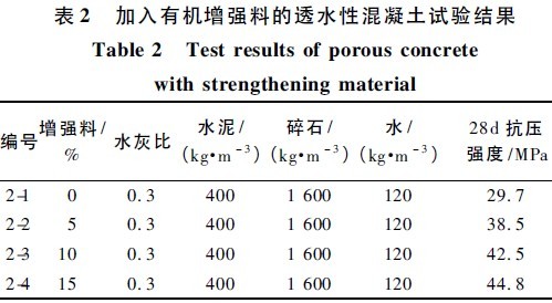 在編號1-4 配合比的基礎上,分別加入水泥用量5%,10%, 15% 的標美彩石產著色增強料,以了解透水混凝土強度的變化。試驗結果如表2 所示。
